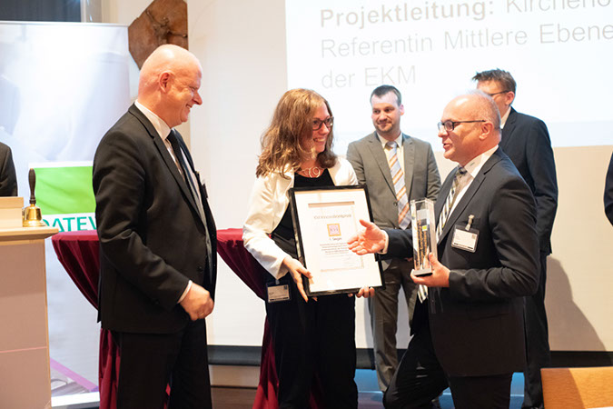 Als erster Sieger des KVI Innovationspreises 2018 wurde die Evangelische Kirche in Mitteldeutschland für das Projekt „Vereinheitlichung und Optimierung des Personalmanagements nach dem Zusammenschluss der Evangelischen Kirchen in Mitteldeutschland“ ausgezeichnet. Projektleiterin und Referentin Mittlere Ebene Personal der Evangelischen Kirche in Mitteldeutschland, Michaela Koch, wurde die Urkunde überreicht. Michael Lehmann, Leiter Dezernat Personal, wurde von Dr. Bernd Eckstein, Senior Consultant bei der DATEV eG, ein von einer heimischen Glasmanufaktur angefertigter KVI Innovationspreis 2018 Kristallglasaward übergeben, der von der Firma DATEV eG gestiftet wurde. Michaela Koch und Michael Lehmann wurden von Dr. Kerstin Voigt, Referatsleiterin Personaleinsatz sowie Martin Drössler, Fachkoordinator Personal Office, begleitet.